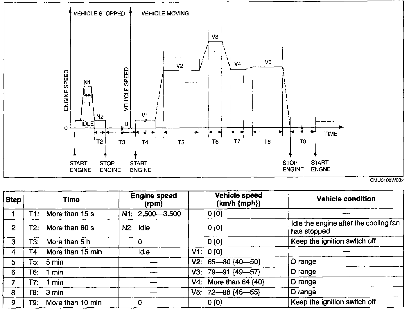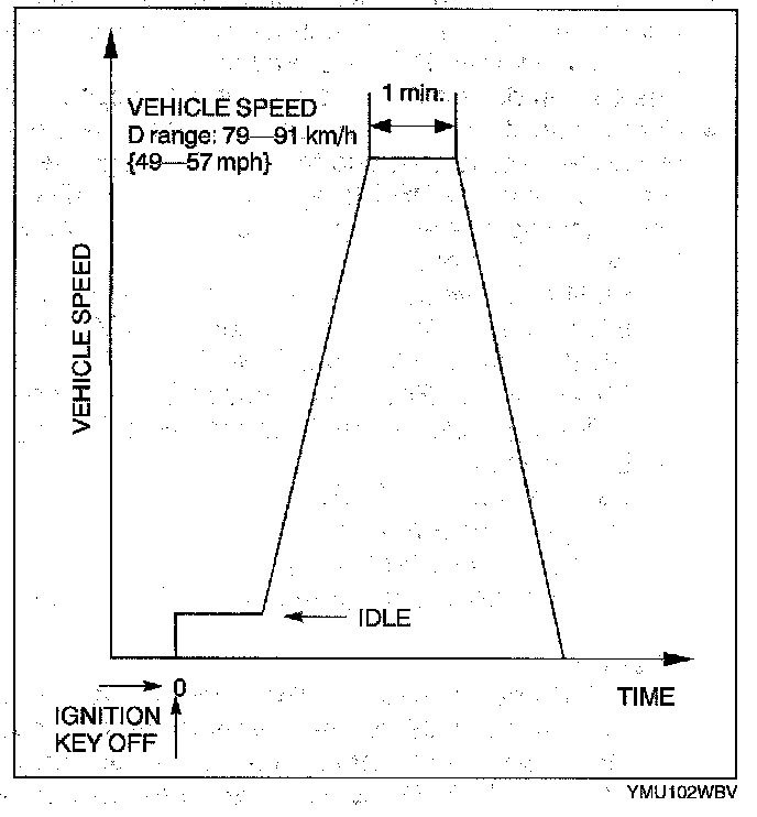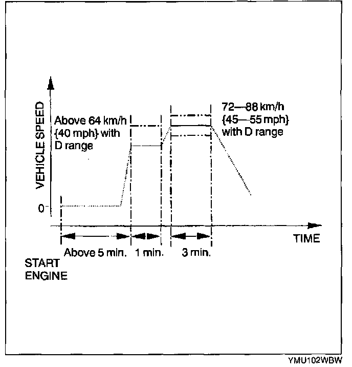 6. Drive the vehicle at the engine speed of 65-80 km/h {40-50 mph} for 5 min or more.