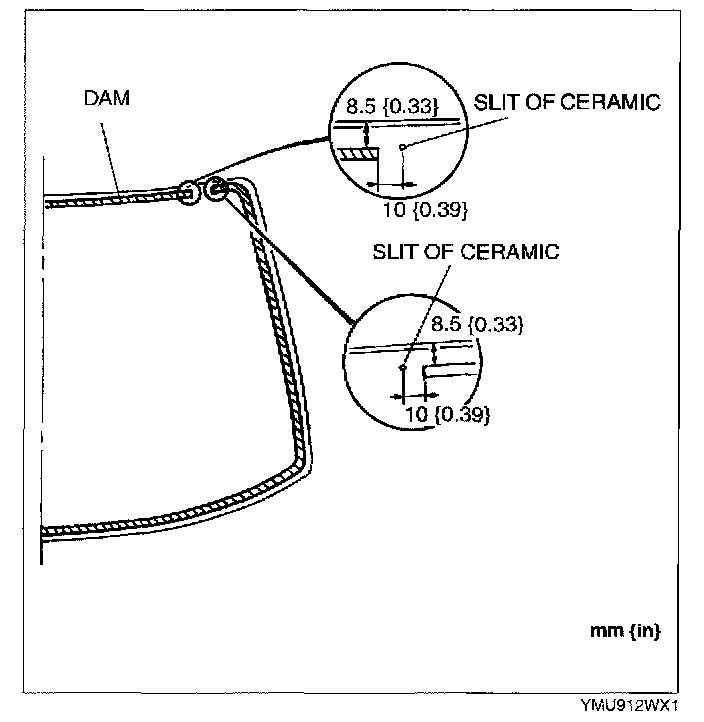 13. Once the primer is dry, apply sealant around the entire circumference to fill the gap between the dam and the edge of the glass measuring 11.0 mm {0.43 in} high and 5.0 mm {0.20 in} wide.
