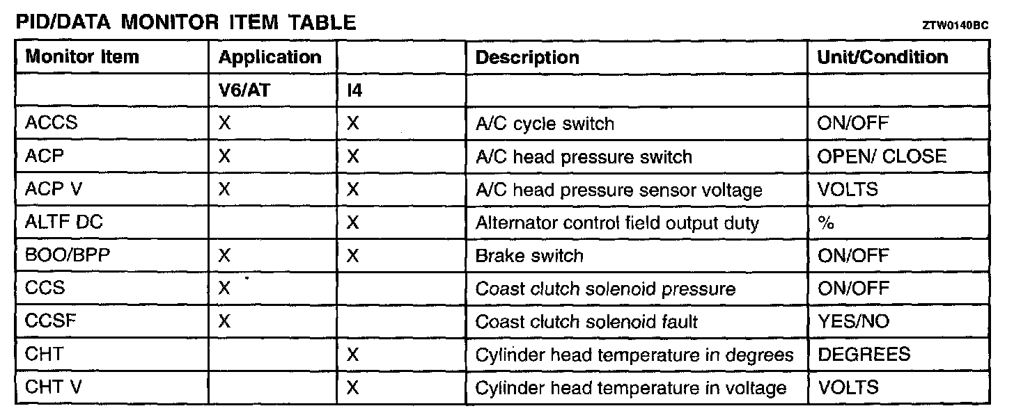 PID/Data Monitor Item Table Part 1: