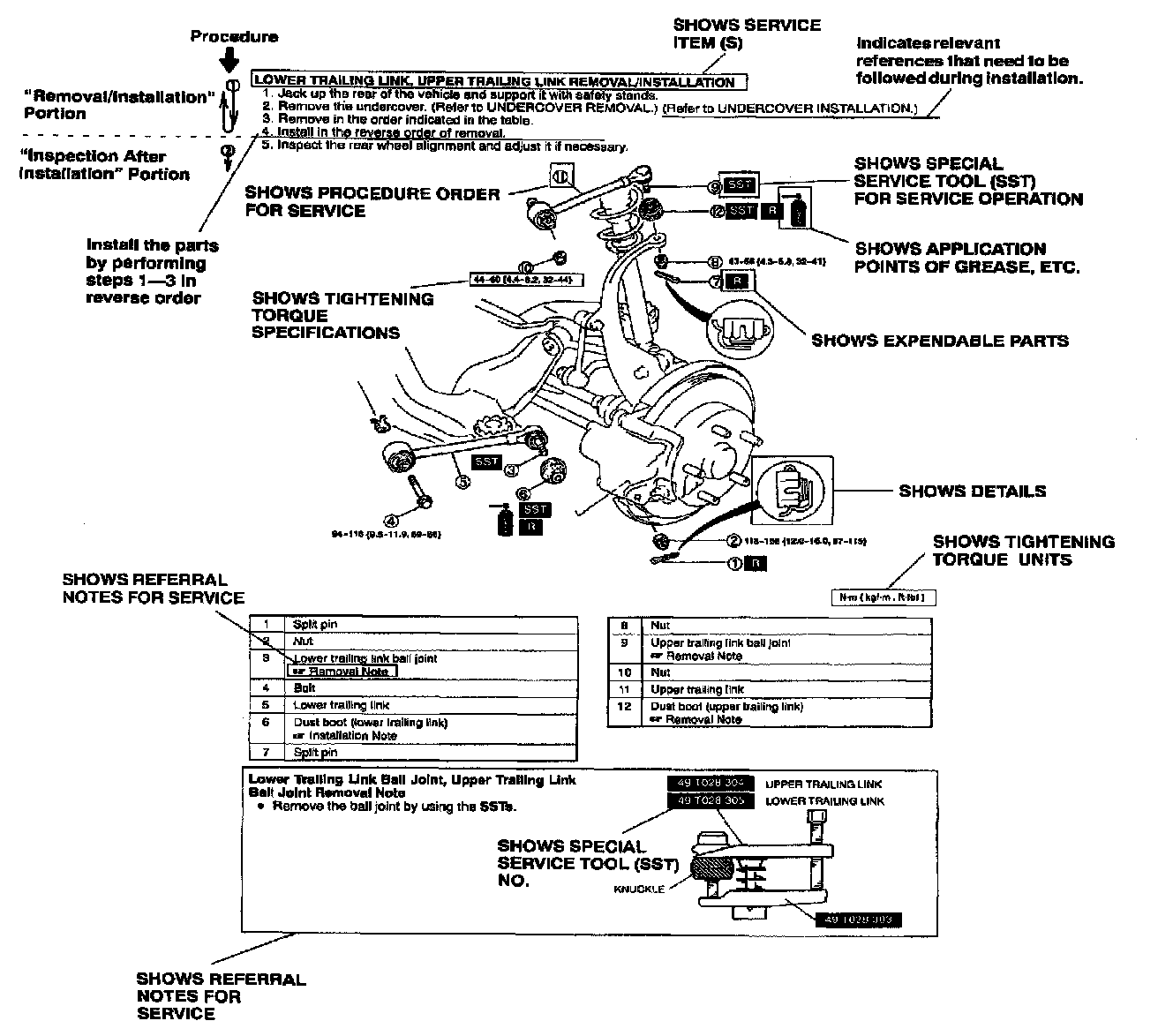 - Inspection and adjustment procedures are divided into steps. Important points regarding the location and contents of the procedures are explained in detail and shown in the illustrations.
