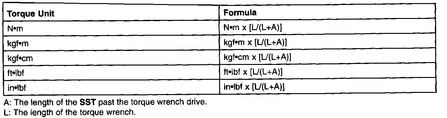 Torque Formulas- When using a torque wrench-SST combination, the written torque must be recalculated due to the extra length that the SST adds to the torque wrench. Recalculate the torque by using the formulas. Choose the formula that applies to you.