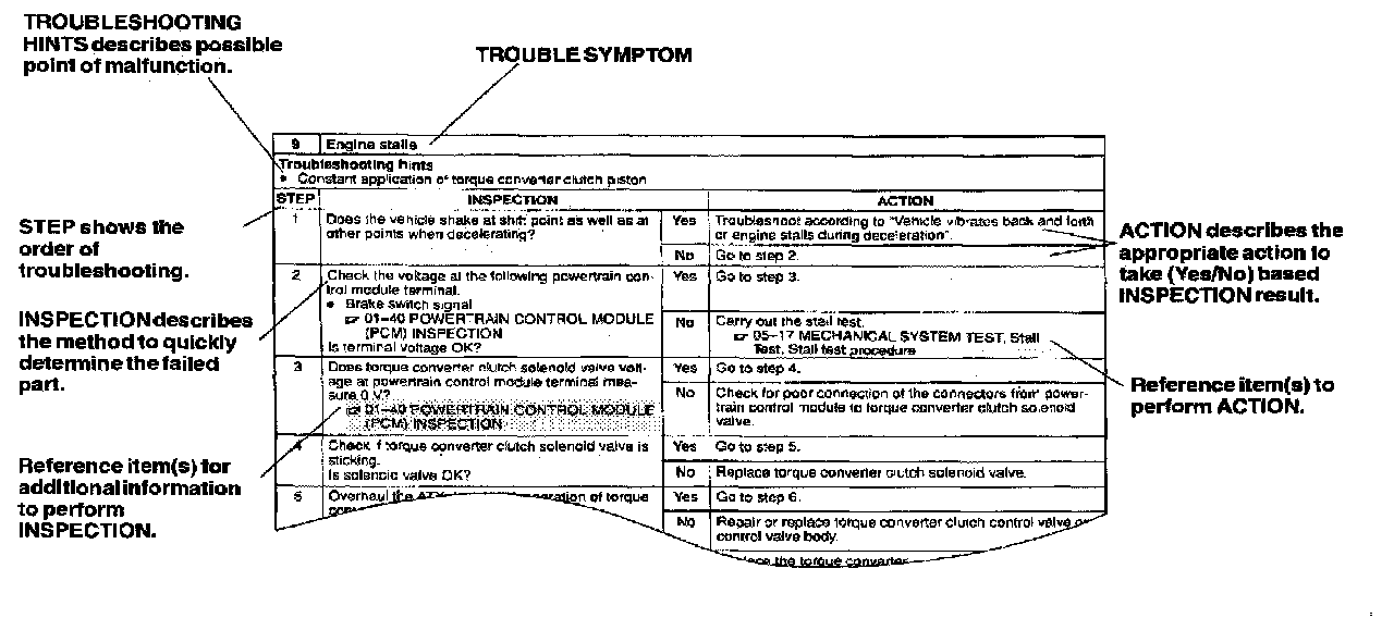 - Symptom troubleshooting shows diagnostic procedures, inspection methods, and proper action to take for each trouble symptom.