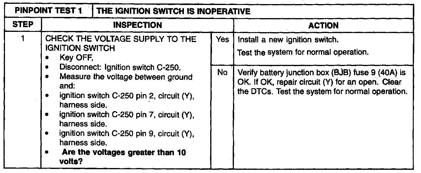 PINPOINT TEST 1: THE IGNITION SWITCH IS INOPERATIVENormal Operation
