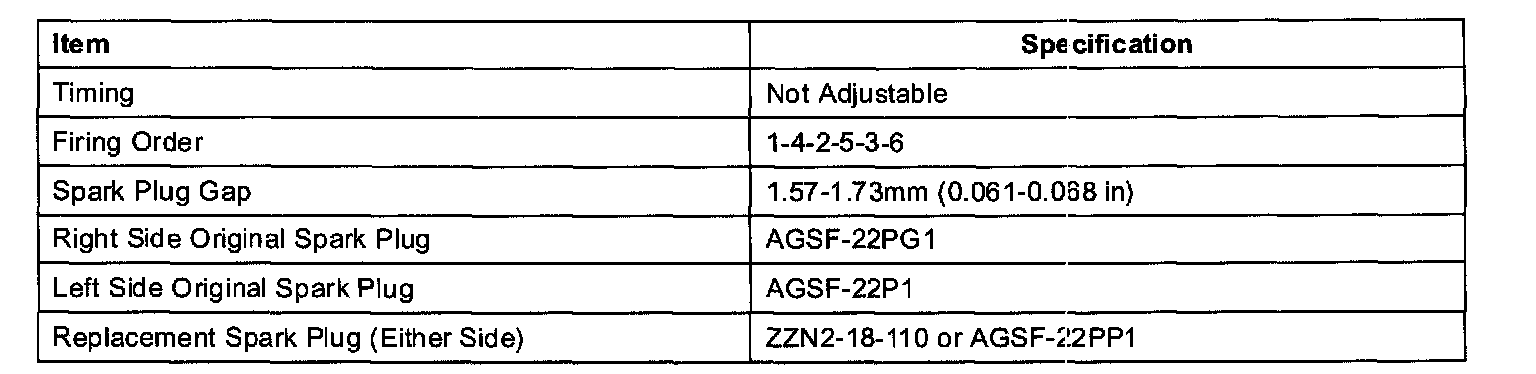 ENGINE IGNITION SPECIFICATIONS1 See Vehicle Emission Control Information (VECI) decal for spark plug and gap specifications. If a spark plug is removed for examination, it must be reinstalled in the same cylinder, Cylinders 1, 2 and 3 use "PG" suffix.