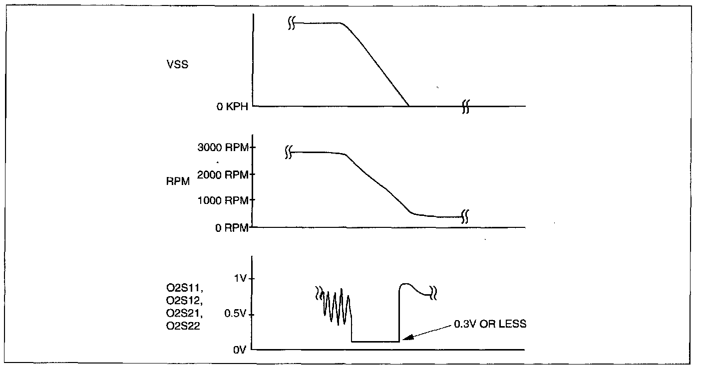 4. Verify that the HO2S outputs a voltage of 0.6 V or more, one time or more, then verify that the HO2S voltage (PID: O2S11, O2S12, O2S21, O2S22) is 0.3 V or less while decelerating as shown in the figure.