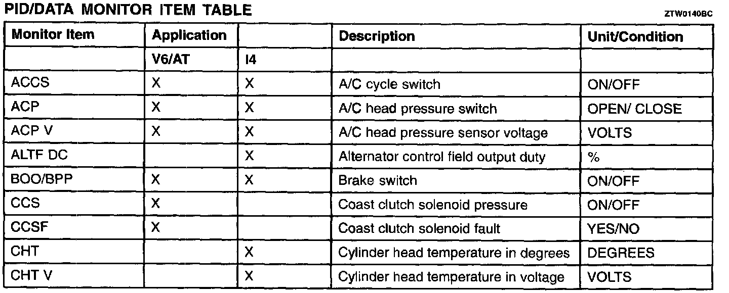 PID/Data Monitor Item Table
