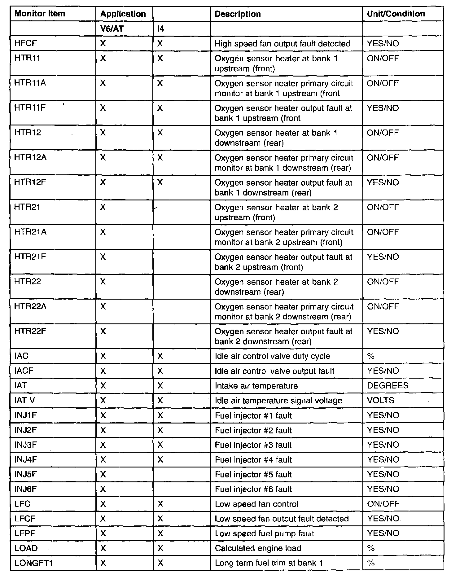 PID/DATA Monitor Item Table (Part 1):