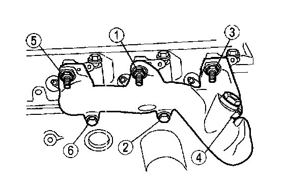 Exhaust manifold RH torque and sequenceInstall the bolts and the nuts. Tighten the sequence shown in two steps: