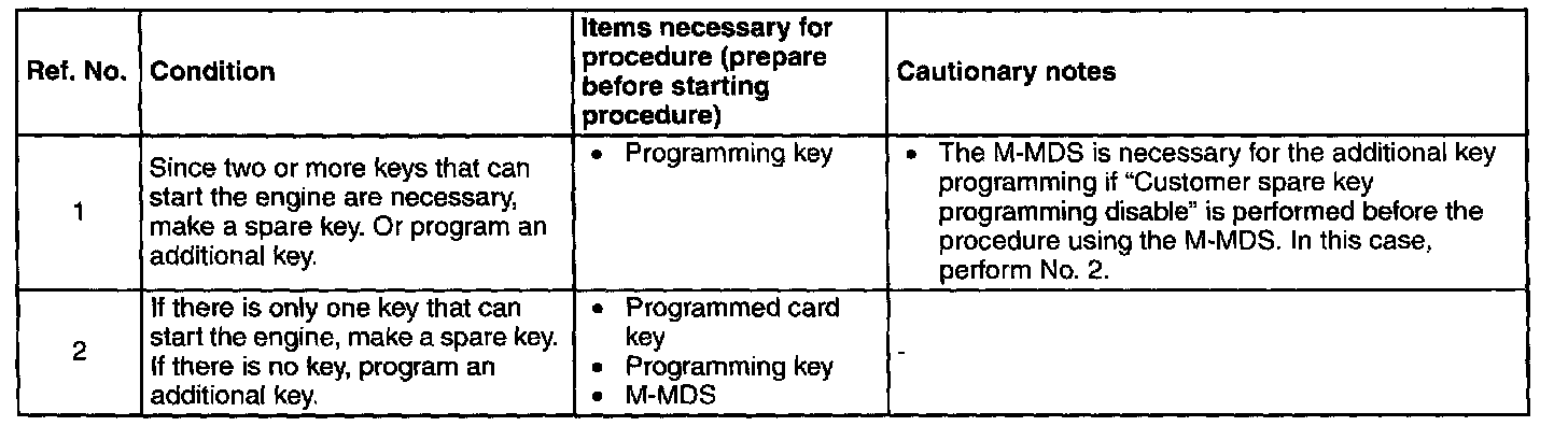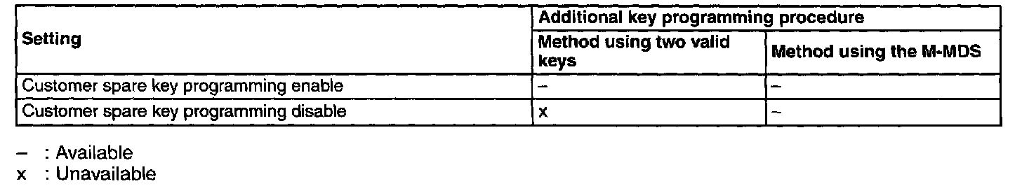 - If "No.1 Additional Key Programming Procedure (Using Two Valid Keys)" is set to disable, the additional key programming can be only performed using the M-MDS preventing the forging of a spare key by using two keys that can start the engine. This function is for use by rental car agencies or other companies with vehicle fleets.