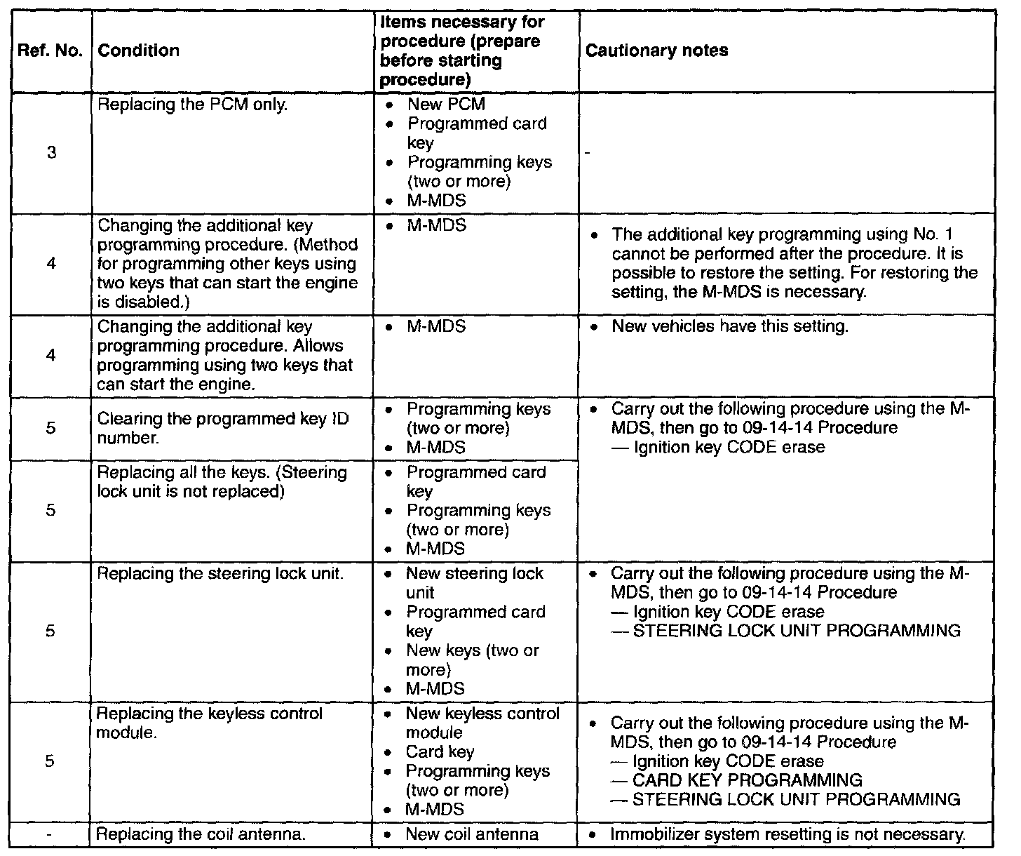 - When performing the following procedures, the immobilizer resetting procedure using the M-MDS must also always be performed: "Keyless control module replacement", "PCM replacement", "Steering lock unit replacement", "Keyless control module and PCM joint replacement", "Keyless control module, PCM, and steering lock unit joint replacement", and "Key ID number clearing". The engine will not start unless all work is performed using the M-MDS.