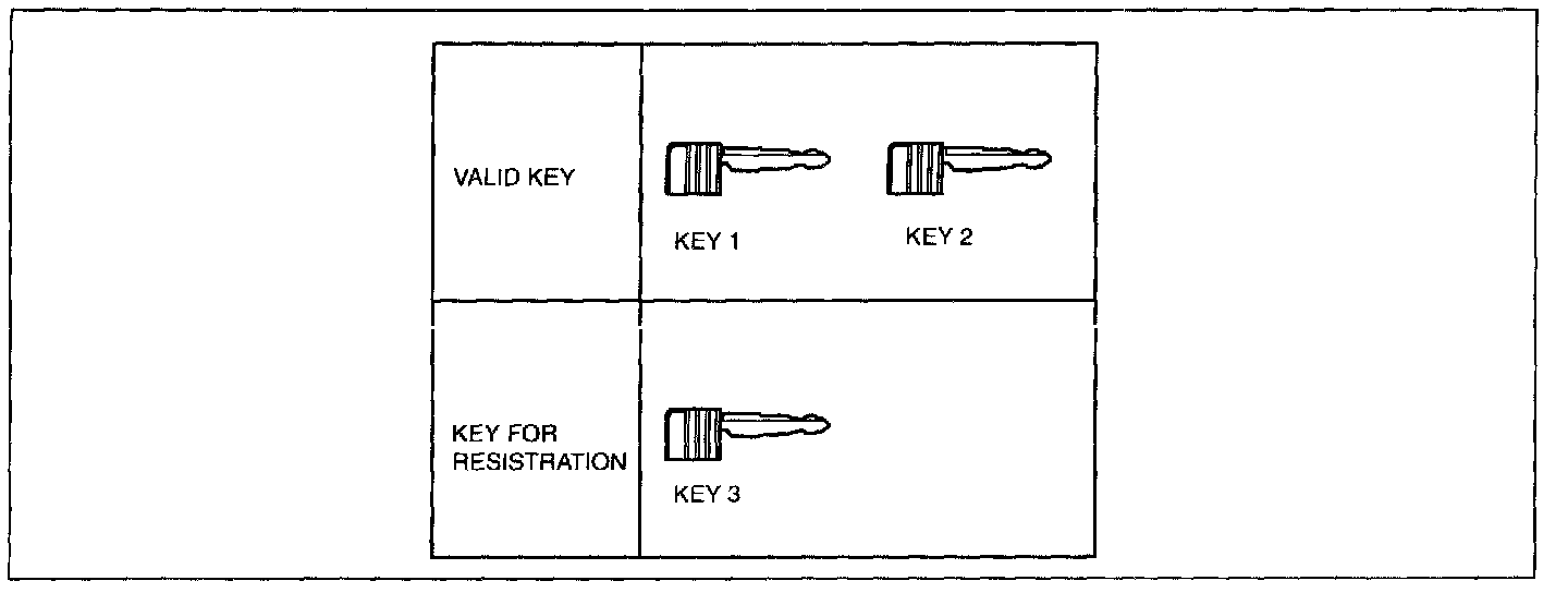 - If eight keys have already been programmed, and it is necessary to program other keys, the previously programmed key ID numbers must first be cleared. To clear the key, refer to "No.1 Additional Key Programming Procedure (Using Two Valid Keys)".