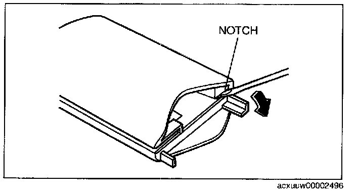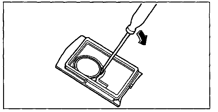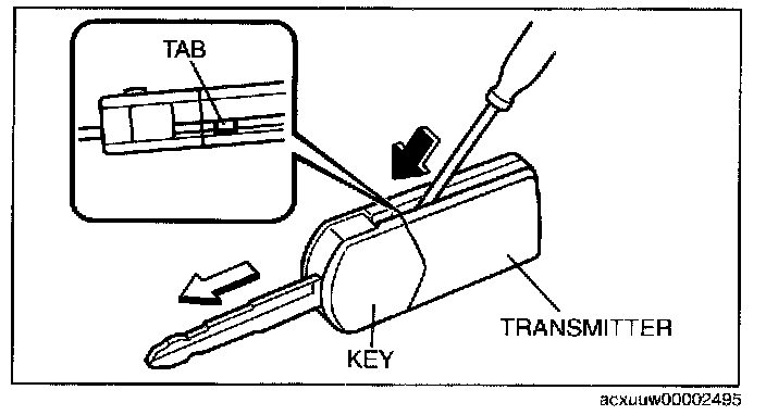 TRANSMITTER BATTERY REPLACEMENT[KEYLESS ENTRY SYSTEM]1. Insert a small flathead screwdriver into the transmitter notch and remove the key from the transmitter by pressing the tab.