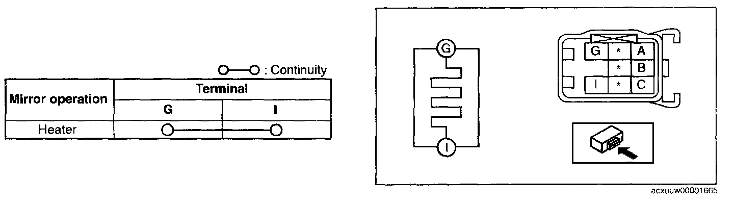 2. Inspect for continuity between the power outer mirror heater terminals.