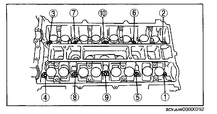 1. Loosen the cylinder head installation bolts in two to three passes in the order shown in the figure and remove them.