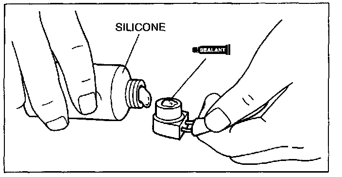 1. Apply approx. 1 g {0.04 OZ} of silicone (Shin-Etsu Silicone KE-347W or similar) to the contact surface of the thermal protector, then thoroughly install it onto the A/C compressor, leaving no gaps.