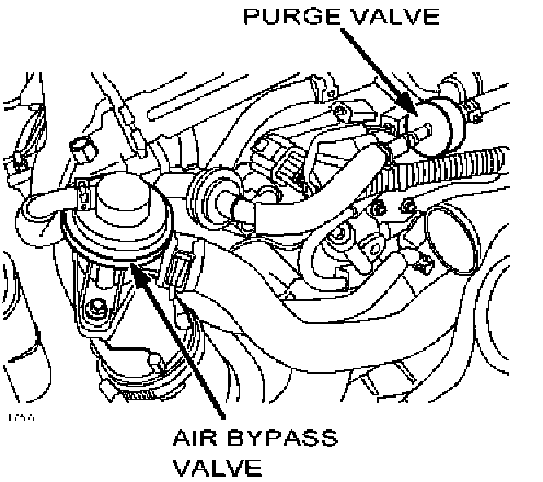8. Disconnect the air bypass hose from the air bypass valve and the purge valve hose from the purge valve, then move the hoses up out of the way.