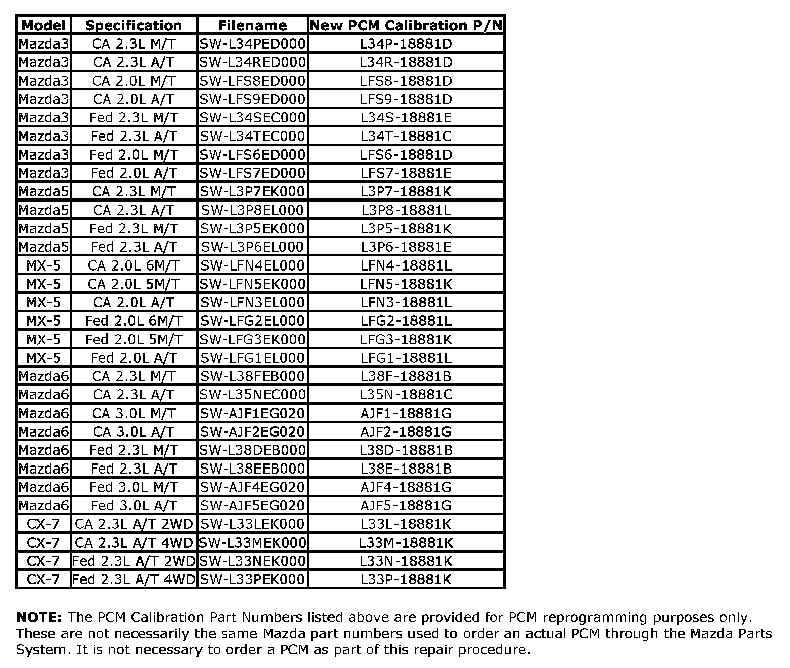 These are not necessarily the same Mazda part numbers used to order an actual TCM through the Mazda Parts System. It is not necessary to order a TCM as part of this repair procedure.