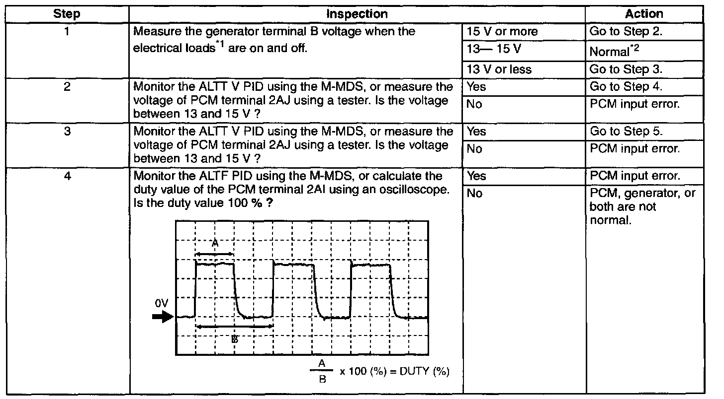 - When the electrical load on the vehicle is low, the specified current cannot be verified although the generator is normal. In this case, increase the electrical load (Leave the headlights turned on for a while, then discharge the battery, or use a similar method.) and recheck.