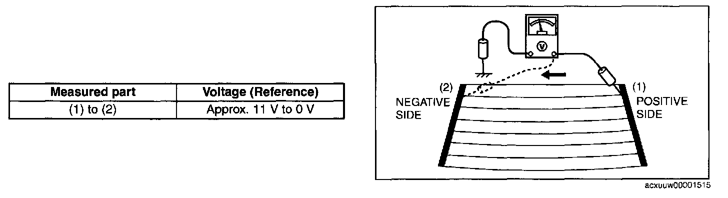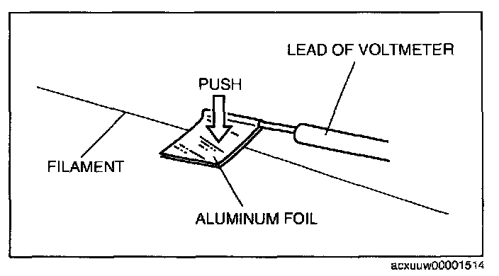 CAUTION: Directly touching the rear window defroster filament with the lead of the tester could damage it. Wrap aluminum foil around the end of the lead and inspect the filament by touching it with the foil.