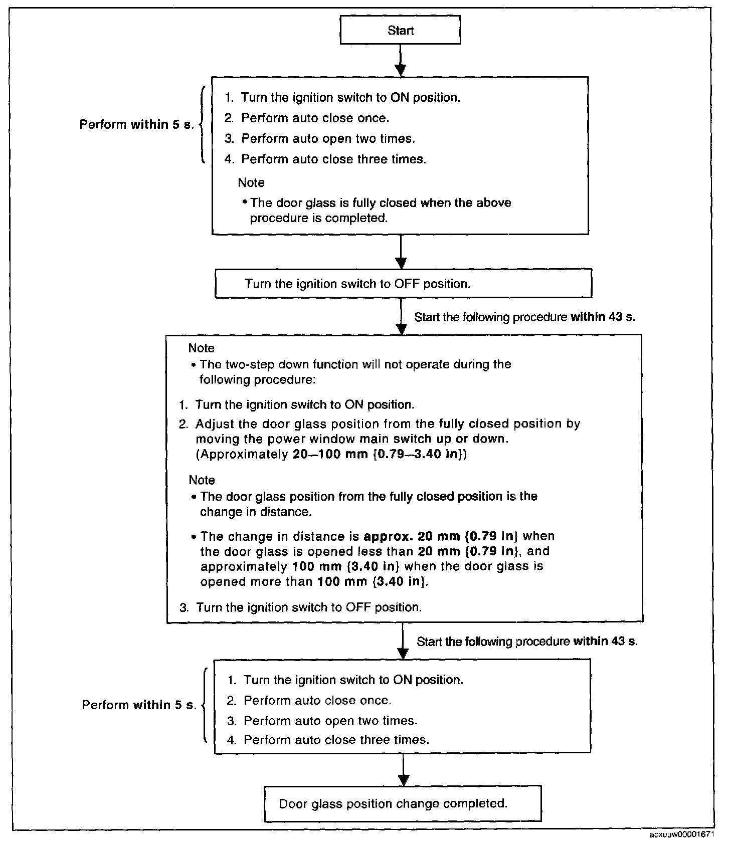 DOOR GLASS POSITION CHANGE PROCEDURENOTE: After performing the following procedure, verify that the two-step down function operates normally and the door glass position has changed. If the two-step down function does not operate or the door glass position has not changed, the procedure was not performed properly. Repeat the procedure from the beginning.