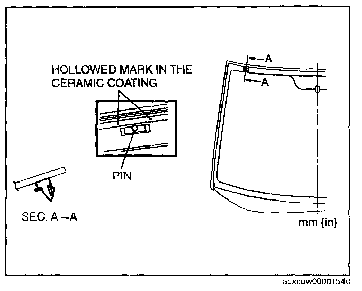 4. Align the marks made before removal and install the pin to the windshield referring to the figure. (when reusing the glass, and the pin was removed)