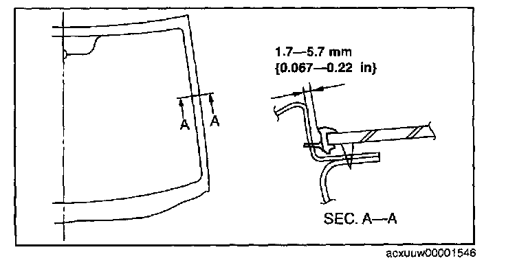 13. Verify that the clearance of the A-pillar is within the range shown in the figure, and press along the perimeter of the glass.
