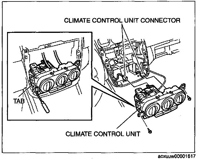 6. Disconnect the climate control unit connectors and remove the climate control unit.