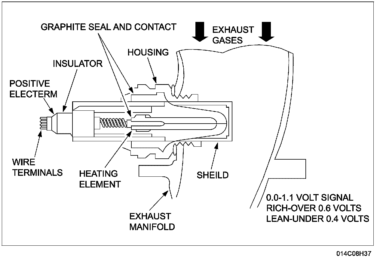 The HO2S detects the presence of oxygen in the exhaust and produces a variable voltage according to the amount of oxygen detected. A high concentration of oxygen (lean air/fuel ratio) in the exhaust produces a voltage signal less than 0.4 volt. A low concentration of oxygen (rich air/fuel ratio) produces a voltage signal greater than 0.6 volt. The HO2S provides feedback to the PCM indicating air/fuel ratio in order to achieve a near stoichiometric air/fuel ratio of 14.7:1 during closed loop engine operation. The HO2S generates a voltage between 0.0 and 1.1 volts.