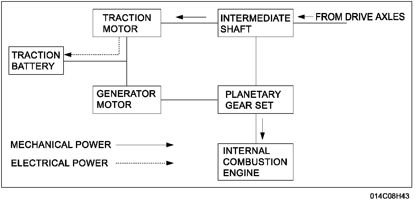 The primary objective of the Electronically Controlled Continuously Variable Transaxle (eCVT) is to deliver torque to the drive axles of the vehicle. The eCVT transmits input torque from the internal combustion engine, or uses electrical power from the high voltage traction battery. The electrical power is converted into mechanical power by the traction motor and the generator motor. The eCVT operates in several different modes, and under certain conditions can transmit power from the traction motor and engine simultaneously or independently.
