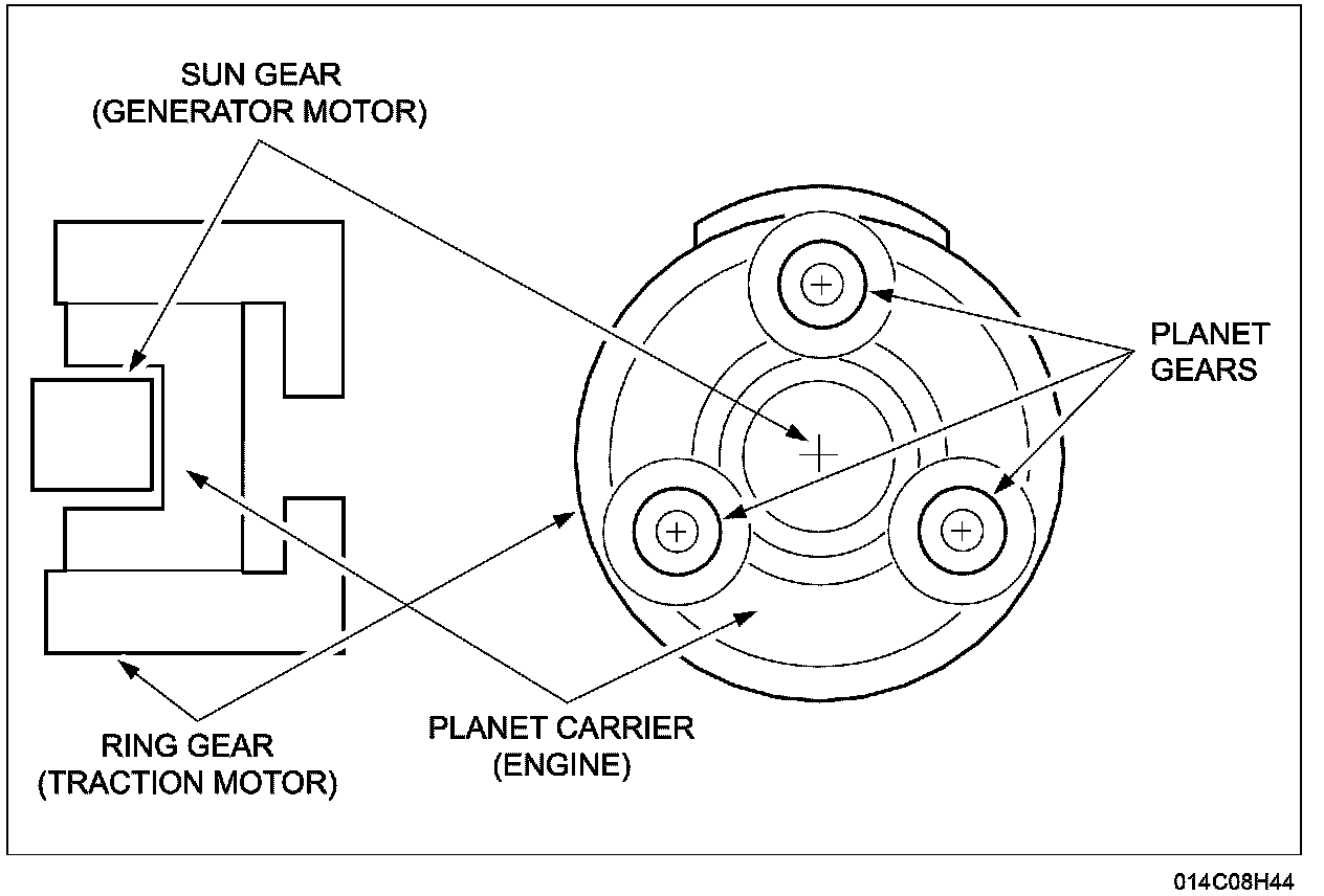 The planetary gear set, the generator motor, and the traction motor are internal to the electronically controlled CVT. The planetary gear set mechanically links the internal combustion engine, the electric traction motor, and the electric generator together. It distributes power between the 3 elements that it connects. The engine is connected to the carrier, the generator motor is connected to the sun gear, and the traction motor is connected to the ring gear of the planetary gear set.