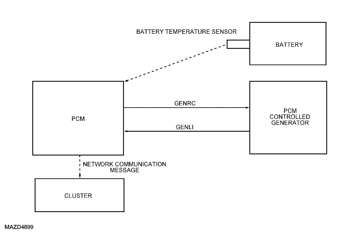 If the PCM detects a charging system error, it broadcasts a low voltage telltale (ON) network communication message which tells the cluster to illuminate the charge indicator. The charge indicator is illuminated if the PCM does not see a signal on the GENLI circuit for a time period greater than 500 milliseconds. This telltale command is also used to indicate over-voltage conditions detected by the PCM-controlled generator.