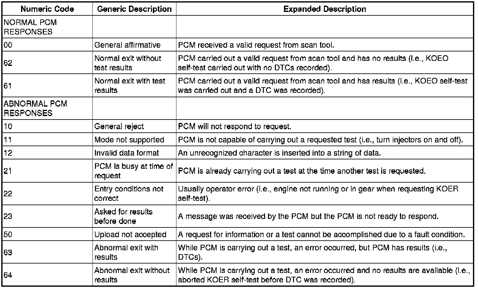 It is possible to receive a communication error from a IDS or equivalent tester when initiating a diagnostic test or accessing PIDs. The communication error can be caused by operator error, the vehicle wiring, connectors, the PCM or other control modules connected to the DLC wiring. The PCM will respond to a IDS or equivalent tester whenever the tool requests a test. These are not DTCs. Listed below are numeric codes and generic descriptions that a scan tool may display when trying to carry out some PCM operations. It is possible to get other numeric codes not listed. For a complete list of communication response codes, See society of automotive engineers (SAE) document J2190 enhanced E/E Diagnostic Test Modes. Some are normal responses to valid requests. The others are communication error responses. If the tool displays any of the communication error responses check scan tool connections, cable/adapters and entry of vehicle information.