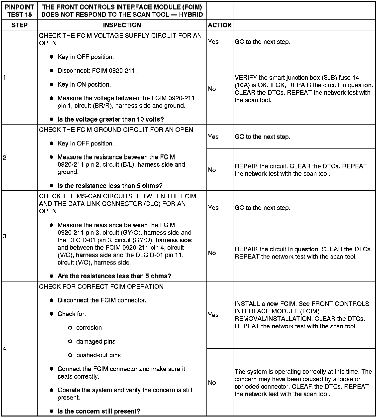 PINPOINT TEST 15: THE FRONT CONTROLS INTERFACE MODULE (FCIM) DOES NOT RESPOND TO THE SCAN TOOL - HYBRID