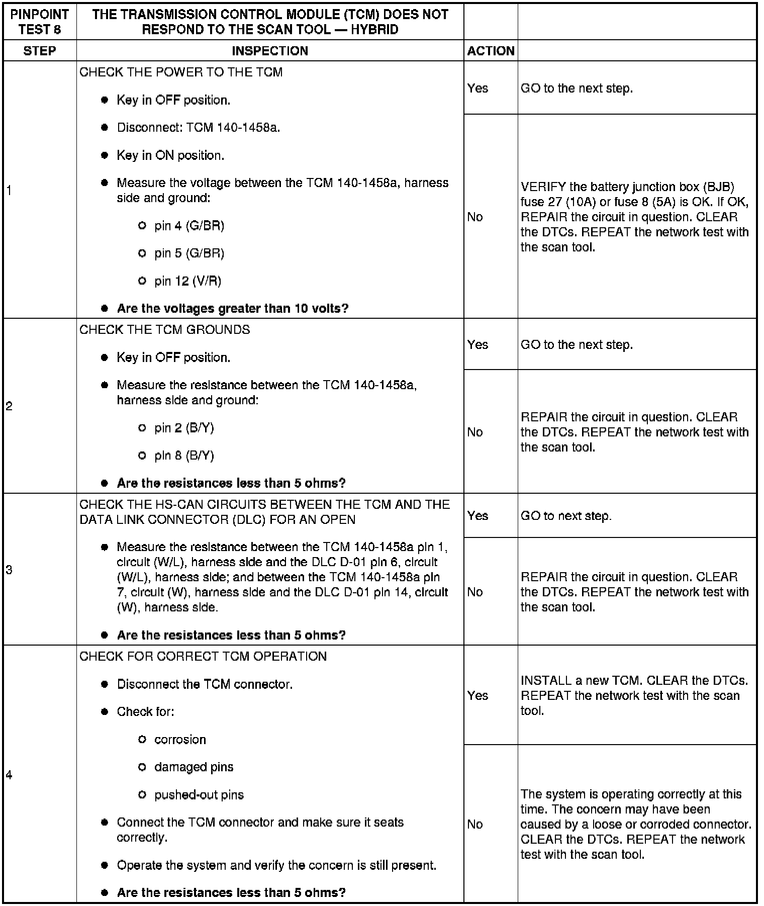 PINPOINT TEST 8: THE TRANSMISSION CONTROL MODULE (TCM) DOES NOT RESPOND TO THE SCAN TOOL - HYBRID