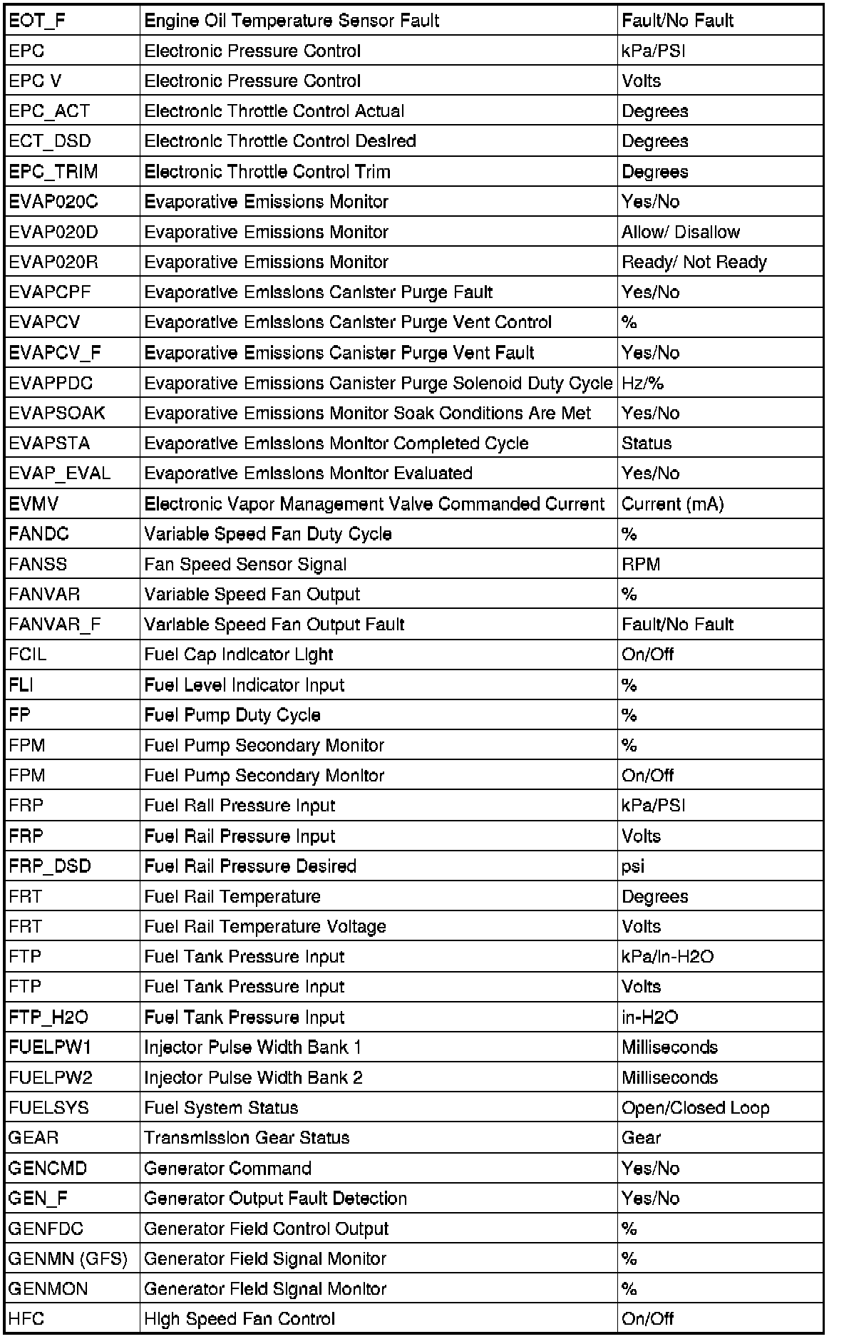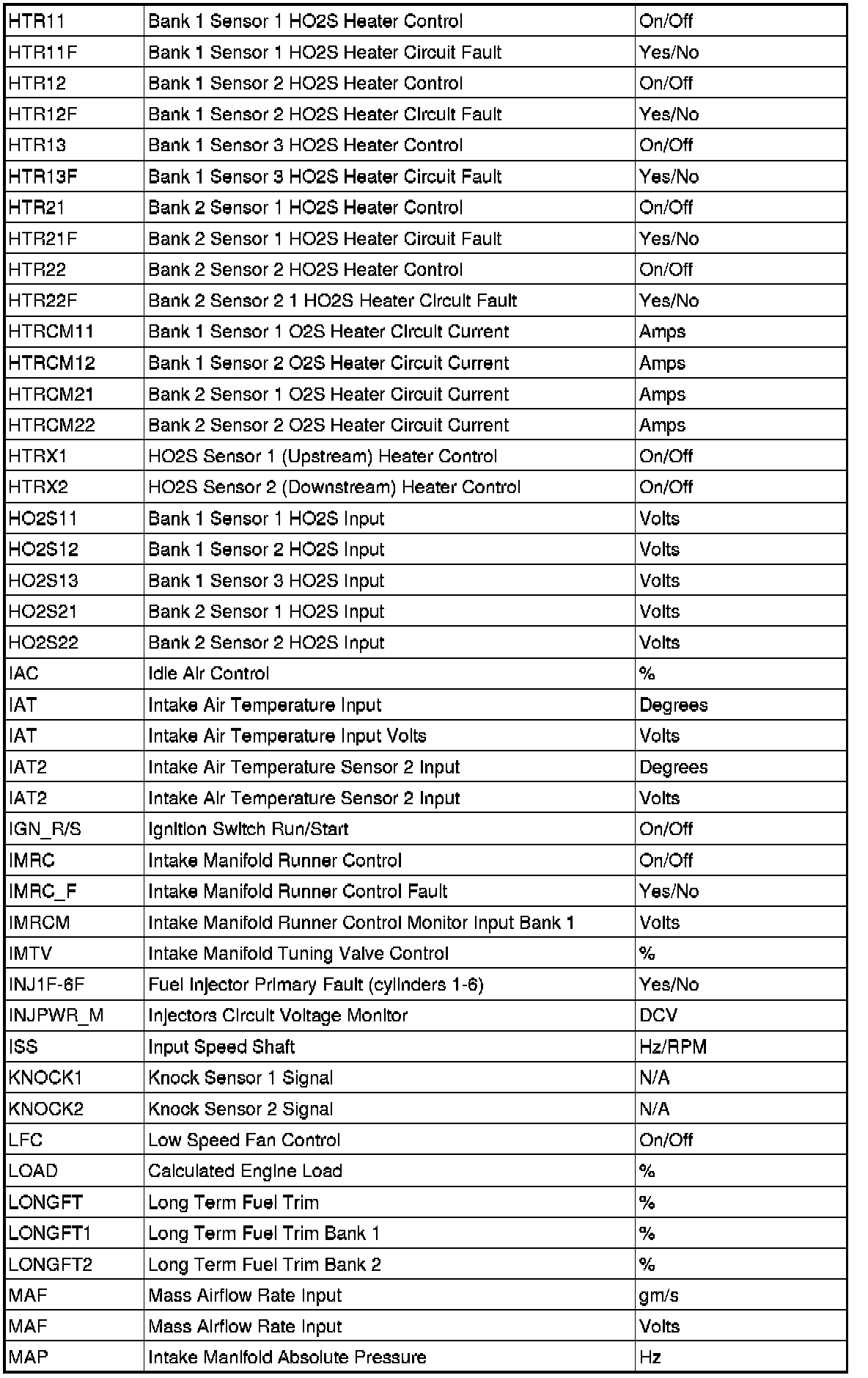 An X in the Freeze Frame column denotes both a mode 1 and mode 2 PID (real time and freeze frame).