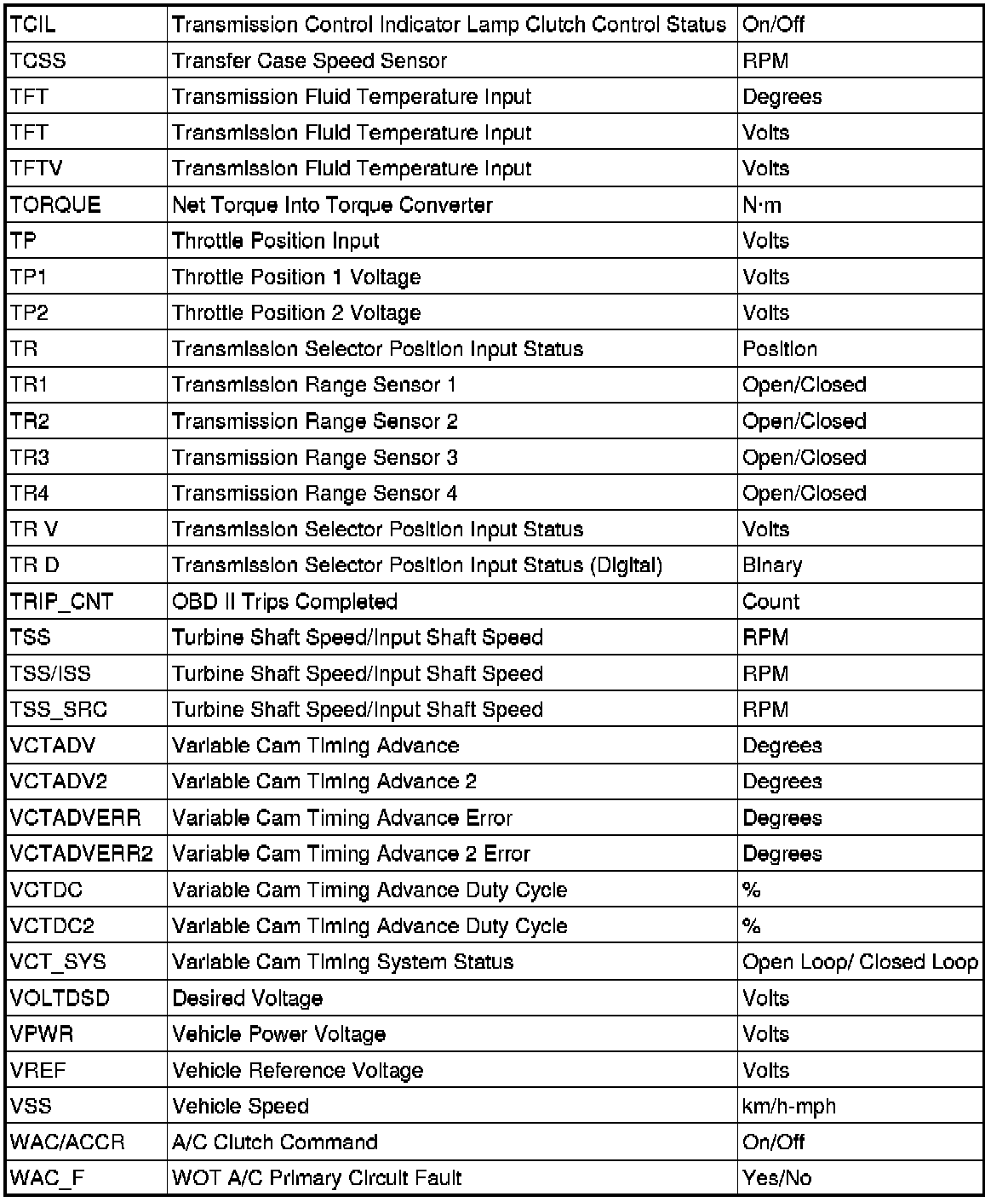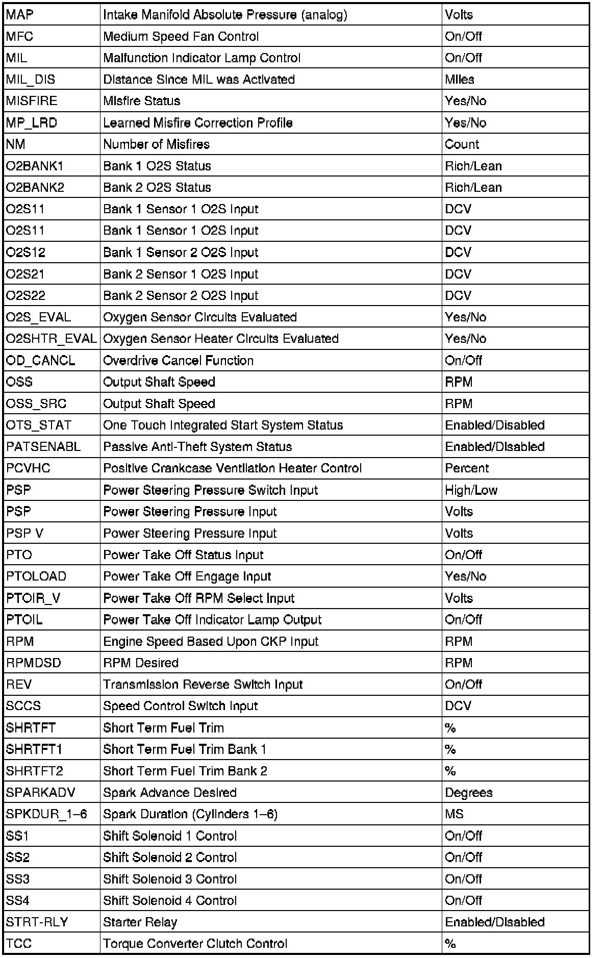 The parameter identification (PID) mode allows access to PCM information. This includes analog and digital signal inputs and outputs along with calculated values and the system status. There are 2 types of PID lists available and both are used throughout this information. The first is generic (J1979) OBD PID list. This is a standard set of PIDs that all scan tools must be able to access. The second is a Mazda-specific (J2190) list which can be accessed by an appropriate scan tool. When accessing any of these PIDs, the values are continuously updated. The generic or Mazda PID list provides definitions and values in appropriate units. For more information, refer to the Society of Automotive Engineers (SAE) document J2205.