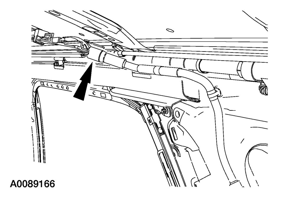 - If equipped with a moonroof and or rear window wiper assembly, note position and routing of the moonroof front drain hose and/or rear window washer solvent hose for installation purposes.