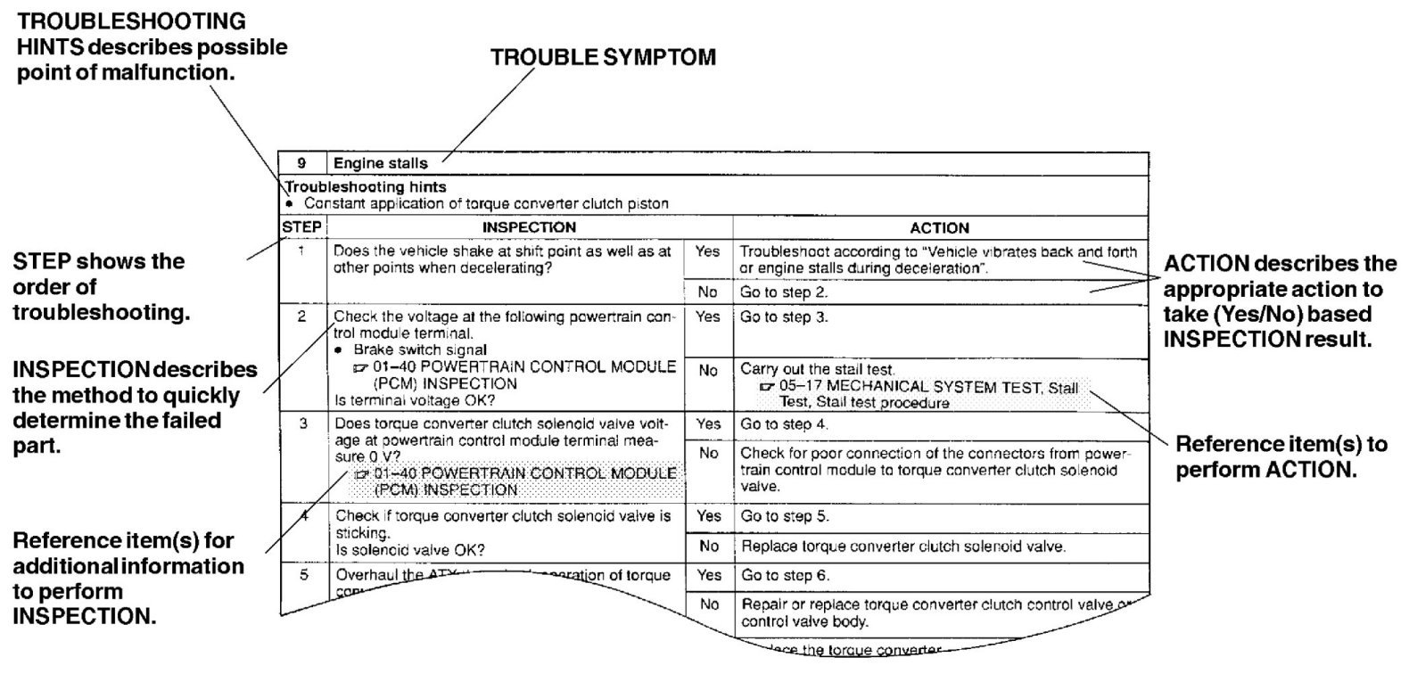 Symptom troubleshooting shows diagnostic procedures, inspection methods, and proper action to take for each trouble symptom.