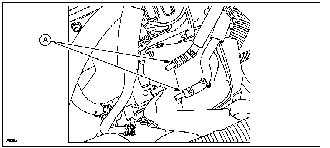 5. Using a cloth to prevent a coolant spill, remove the water hoses and plug them with commercial plugs (A).