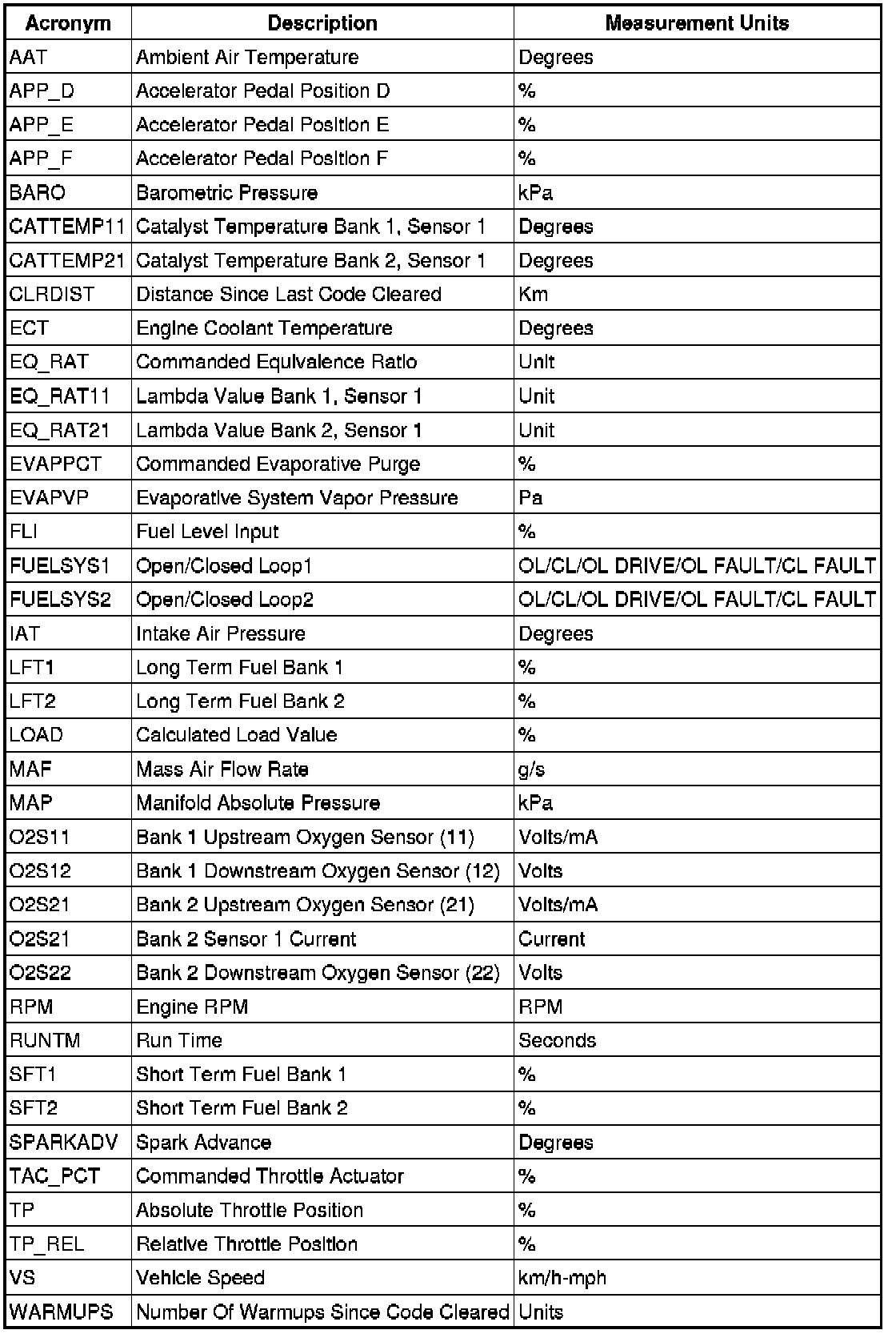 Freeze Frame Data allows access to emission-related values from specific generic parameter identification (PIDs). These values are stored when an emission-related DTC is stored in continuous memory. This provides a snapshot of the conditions that were present when the DTC was stored. Once one set of freeze frame data is stored, this data remains in memory even if another emission-related DTC is stored, with the exception of misfire or fuel system DTCs. Once freeze frame data for misfire or fuel system DTC is stored, it overwrites any previous data, and freeze frame data is no longer overwritten. When a DTC associated with the freeze frame is erased or the DTCs are cleared, new freeze frame data can be stored again. In the event of multiple emission-related DTCs in memory, always note the DTC for the freeze frame data.Freeze Frame Data Table