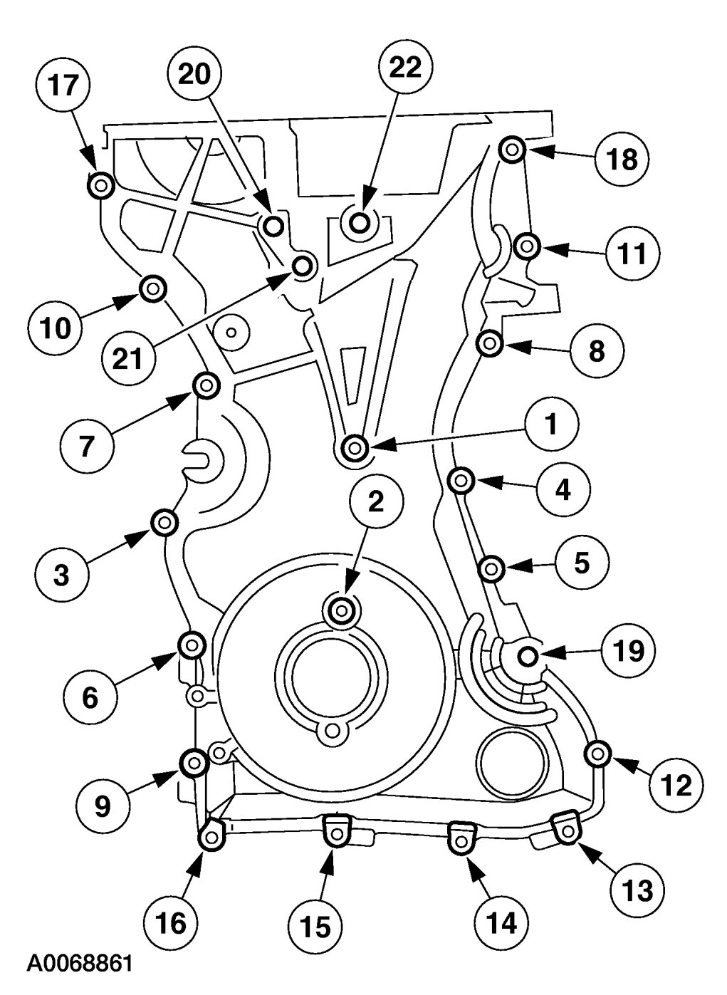NOTE:The engine front cover must be installed and the bolts tightened within 4 minutes of applying the silicone gasket and sealant.Install the engine front cover. Tighten the bolts in the sequence shown, to the following specifications: