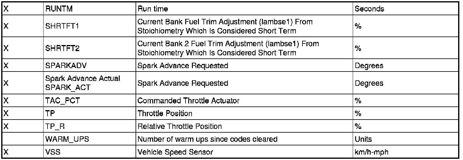 An X in the Freeze Frame column denotes both a mode 1 and mode 2 PID (real time and freeze frame).
