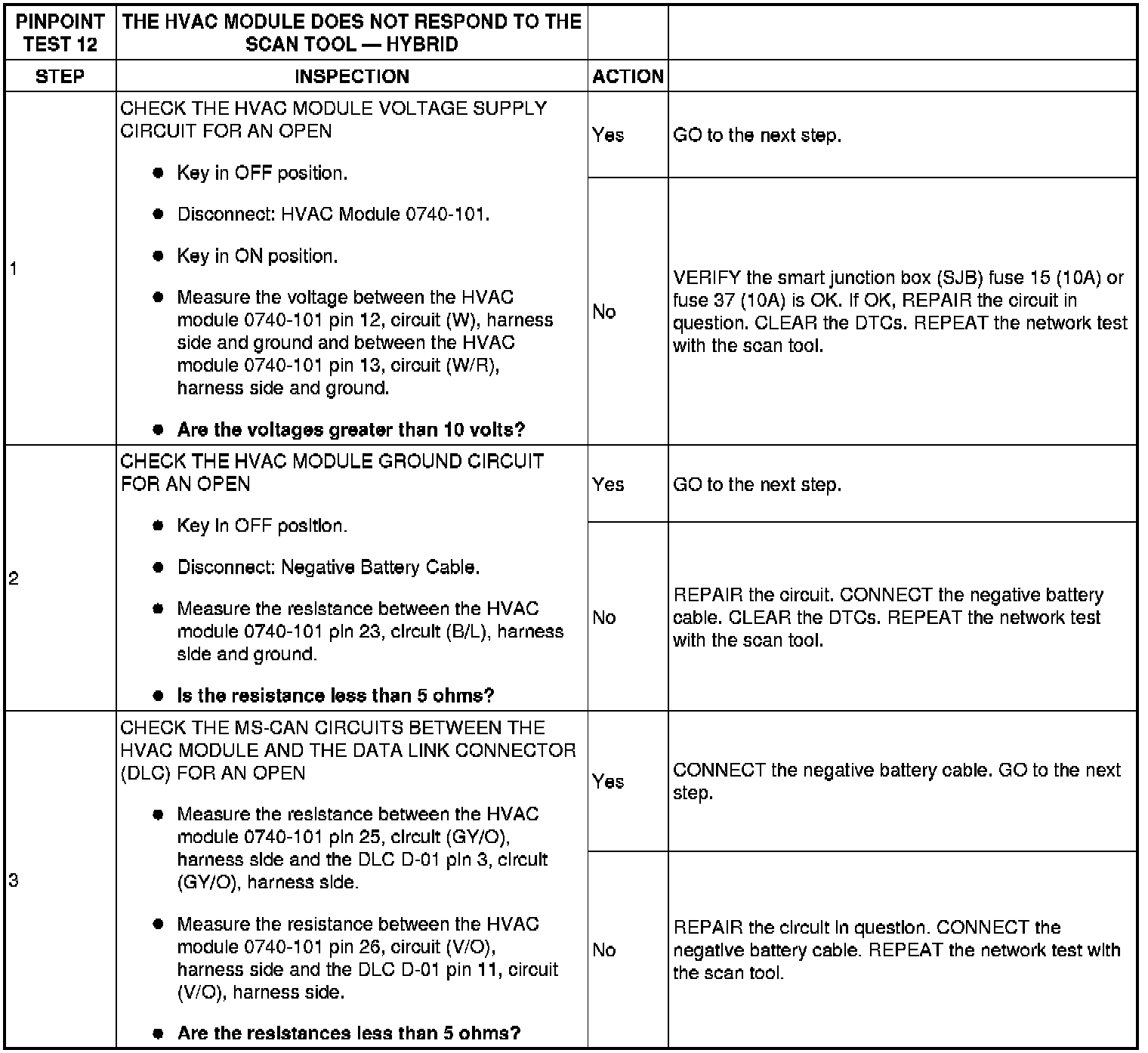 PINPOINT TEST 12: THE HVAC MODULE DOES NOT RESPOND TO THE SCAN TOOL - HYBRID
