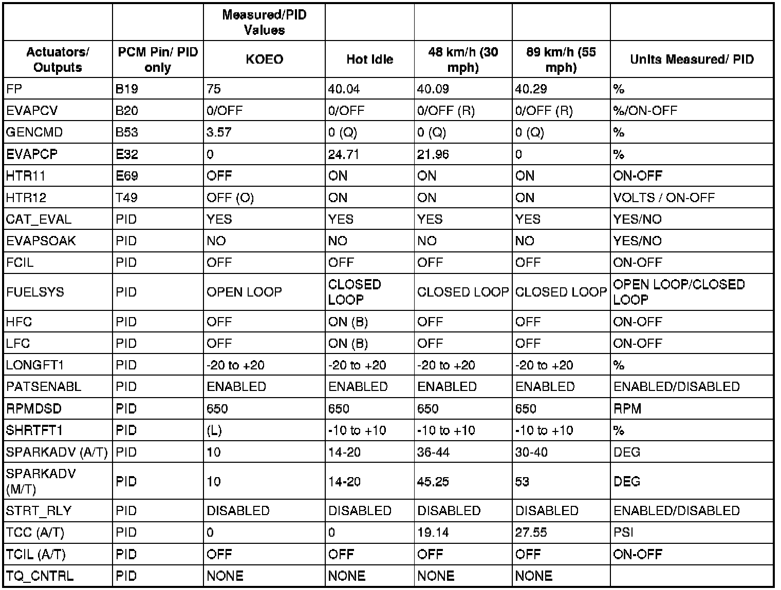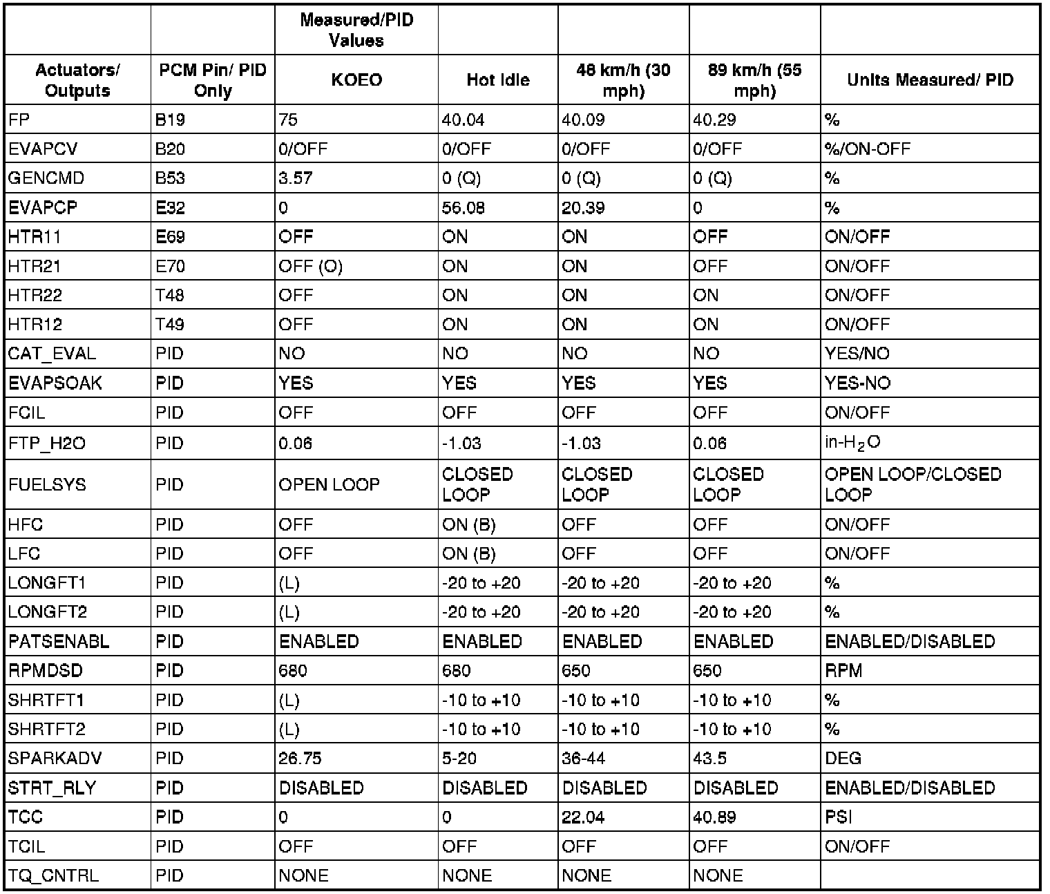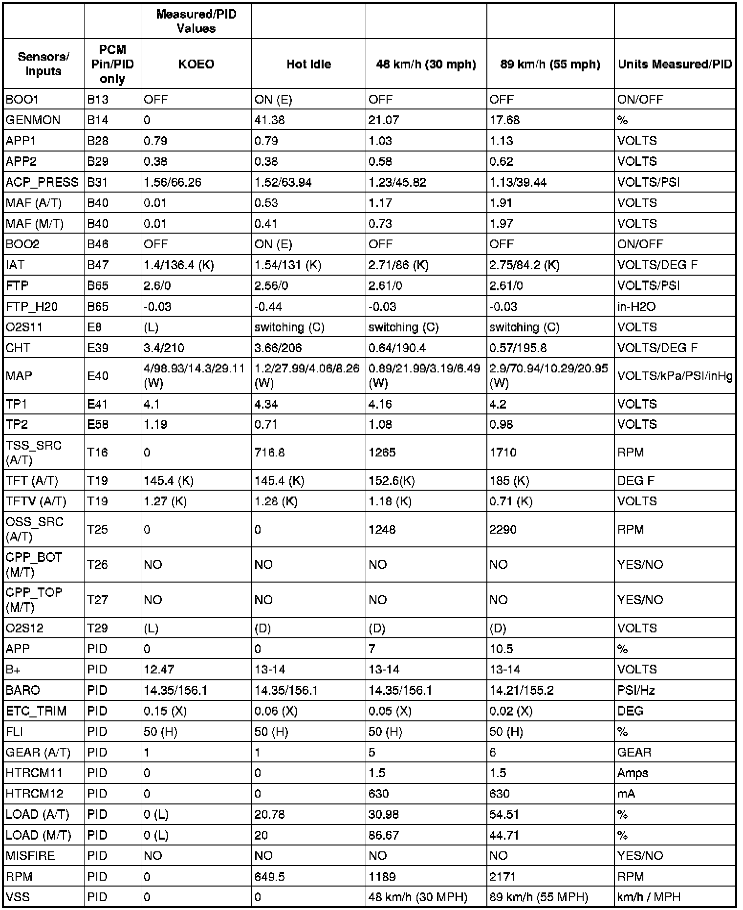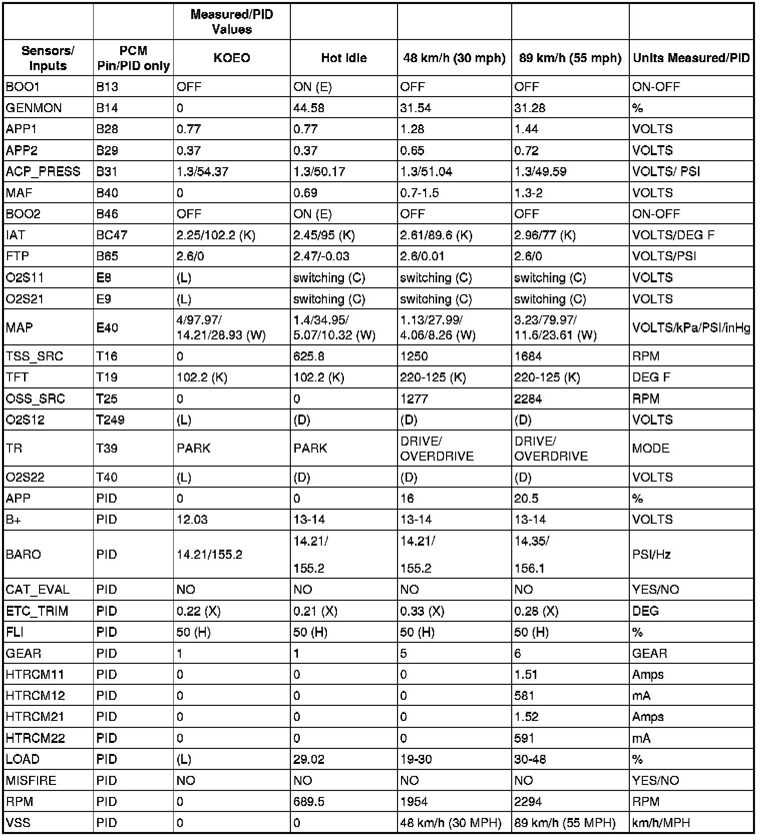 PID/DATA MONITOR REFERENCE VALUES