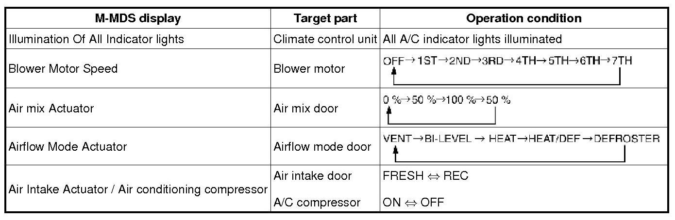 A/C Operation Check Mode Table