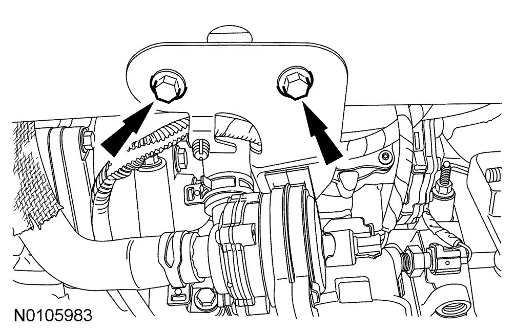 7. Remove the 2 Motor Electronics (M/E) coolant pump bolts and position the pump aside.