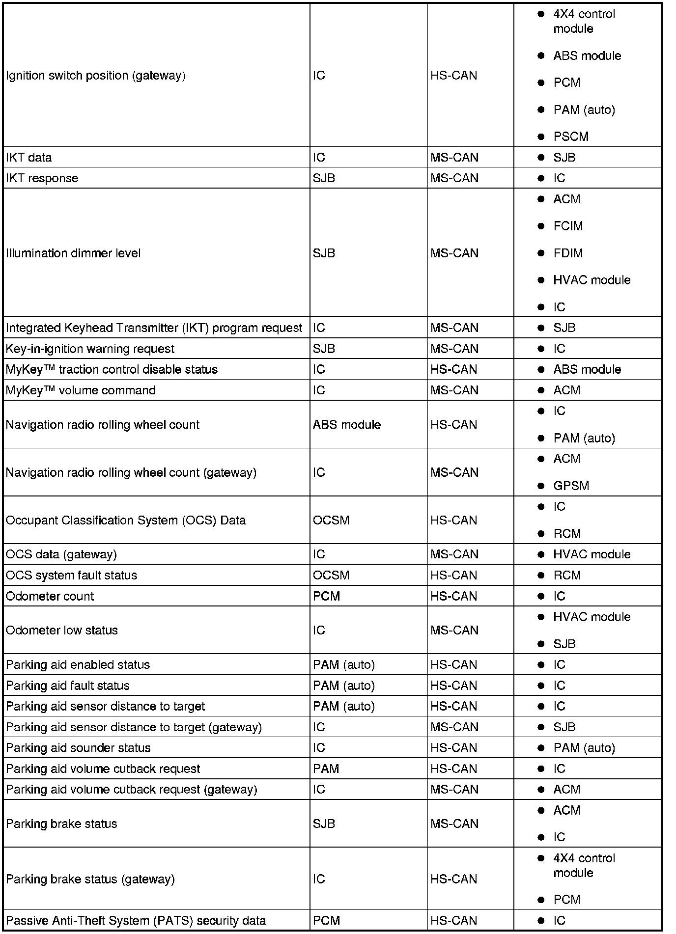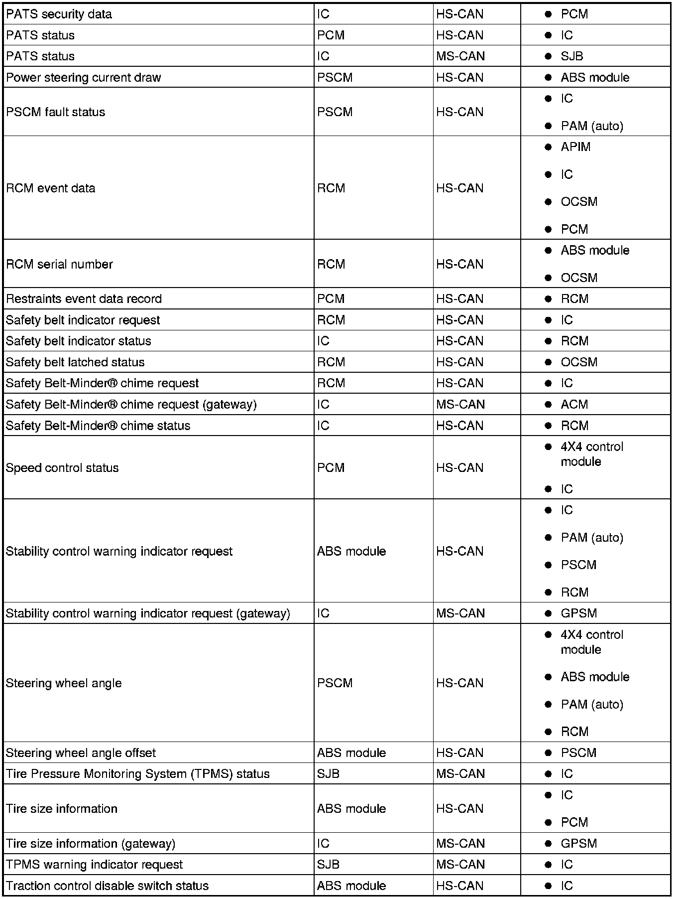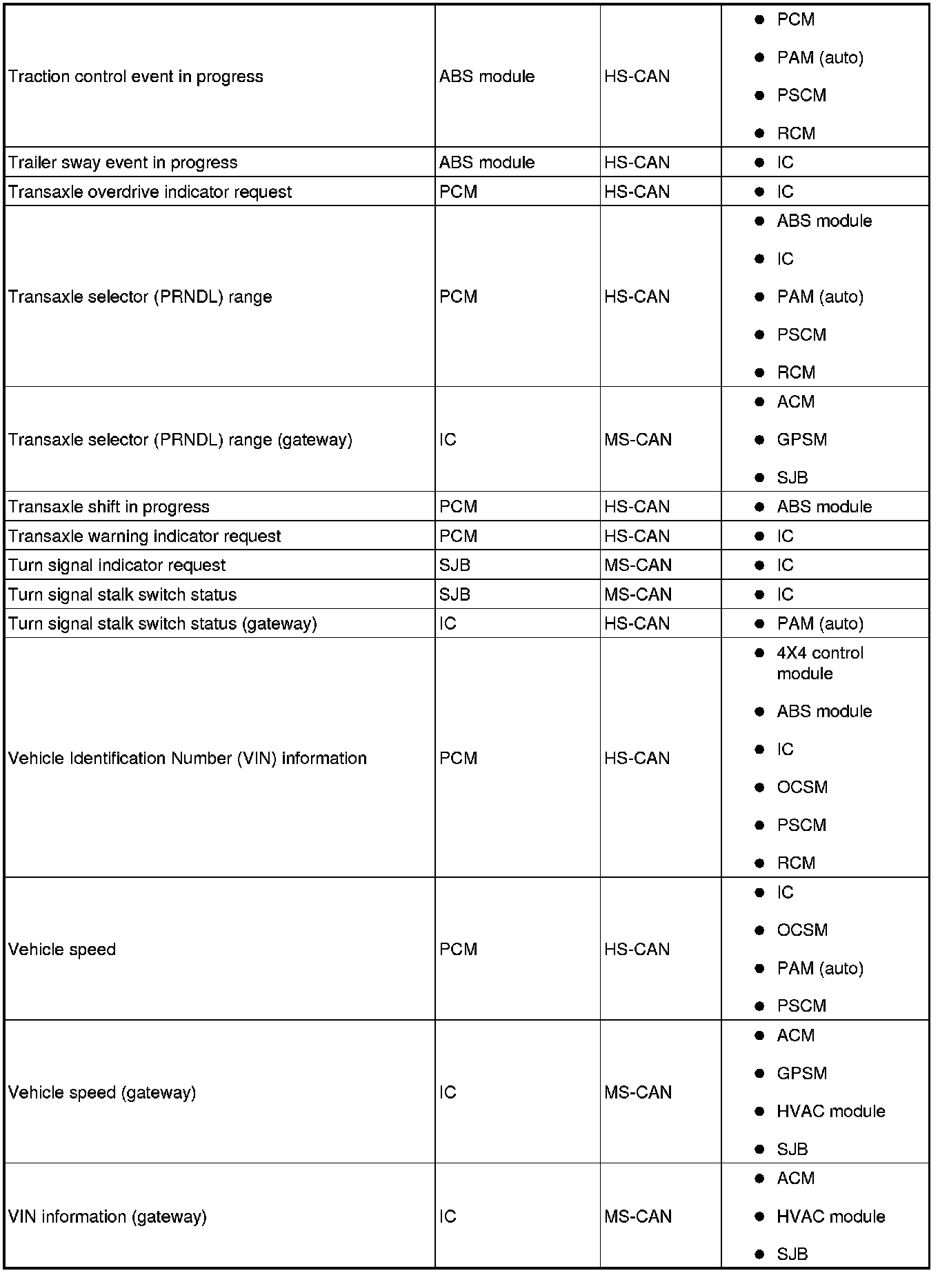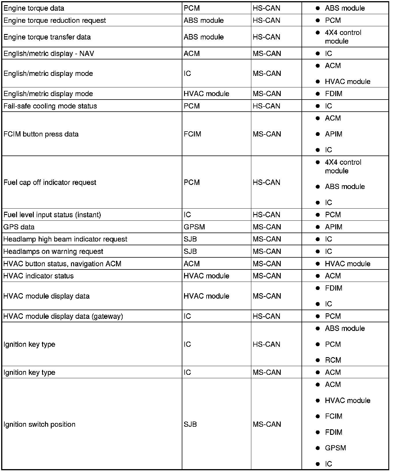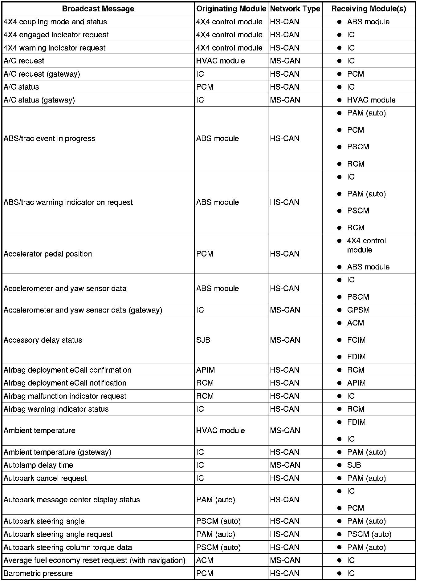 Modules on the CAN utilize simultaneous communication of 2 or more messages on the same network circuits. The following chart summarizes the messages sent and received on the network.