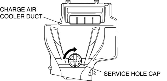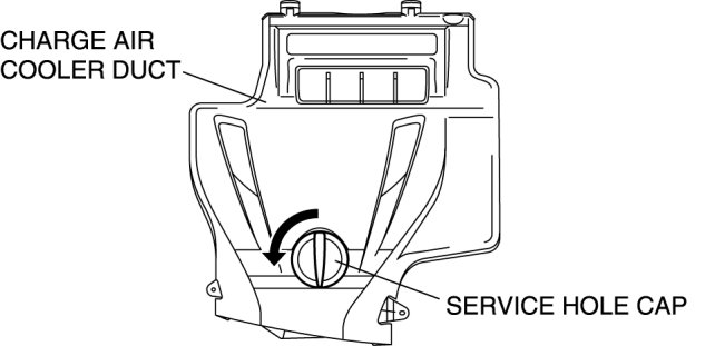 4. Rotate the service hole cap (installed to charge air cooler duct) used to remove/install the dipstick in the direction shown in the figure and remove it.
