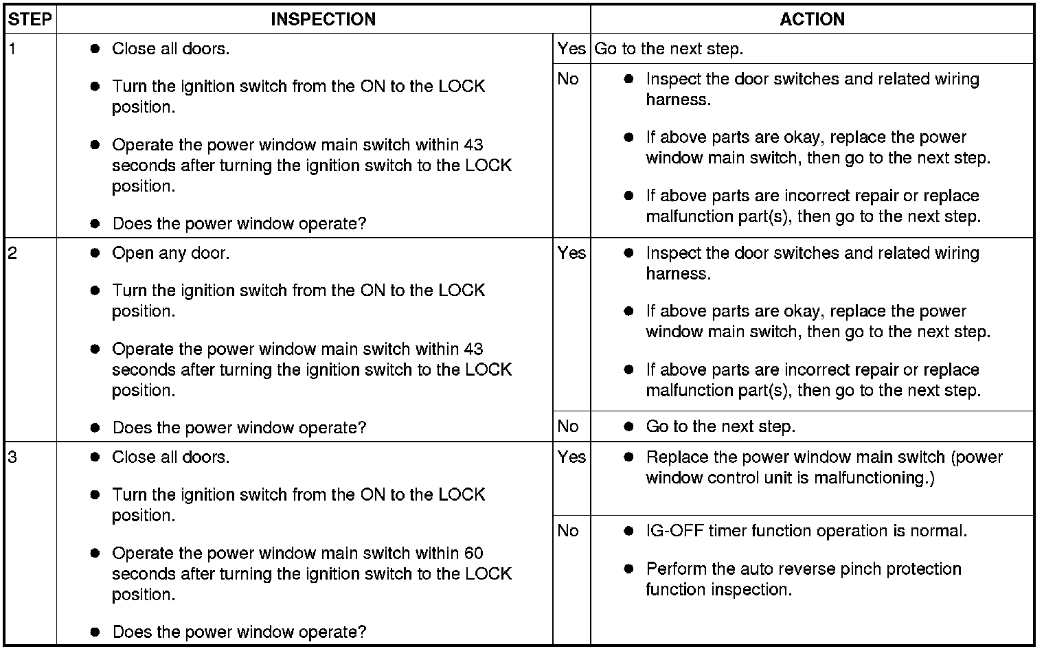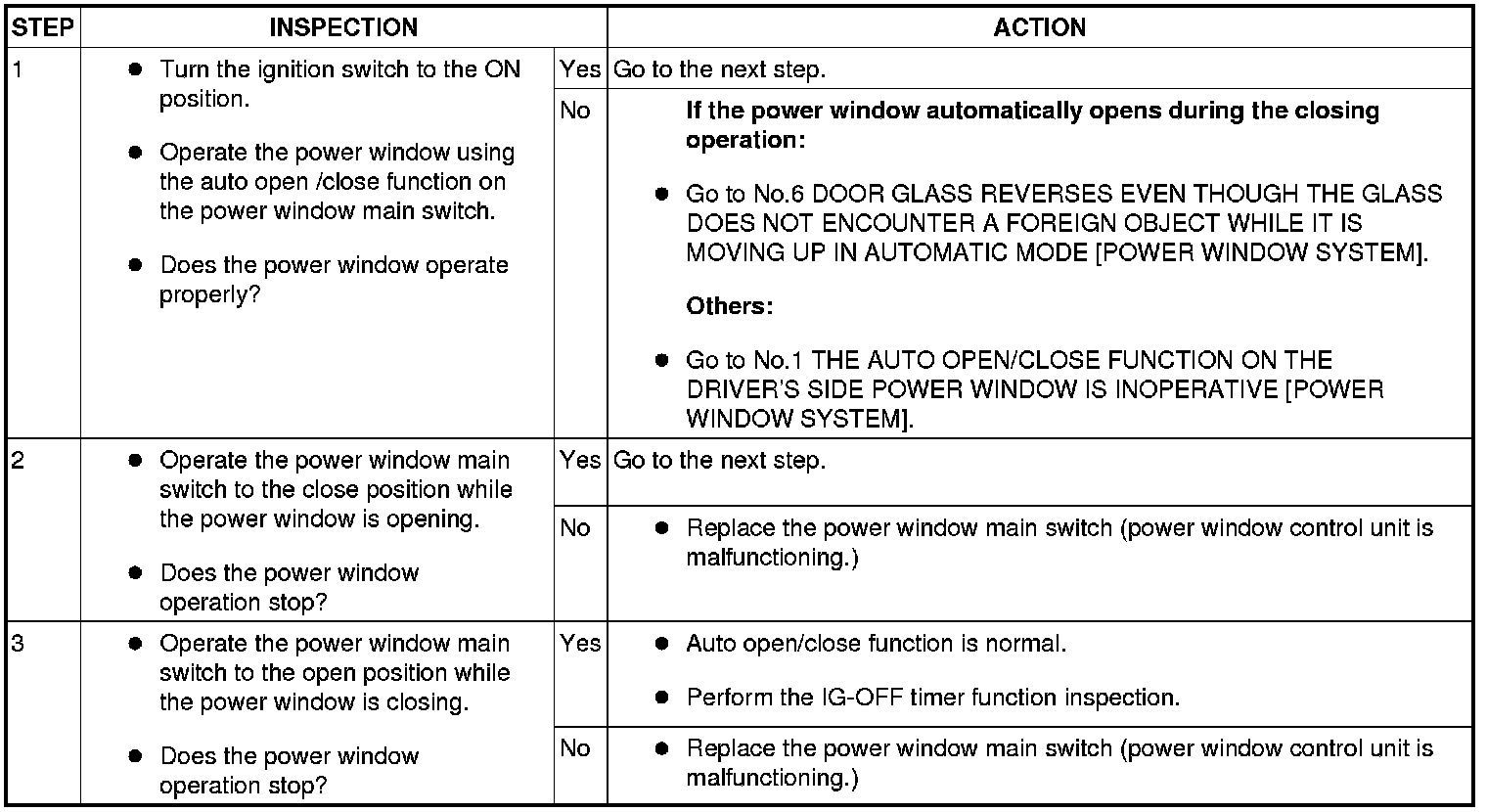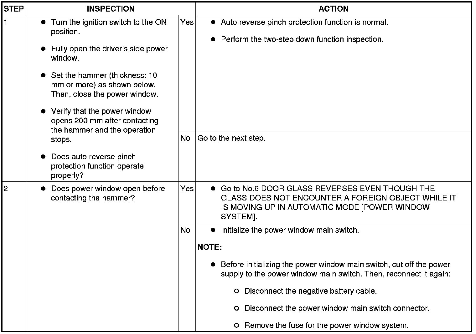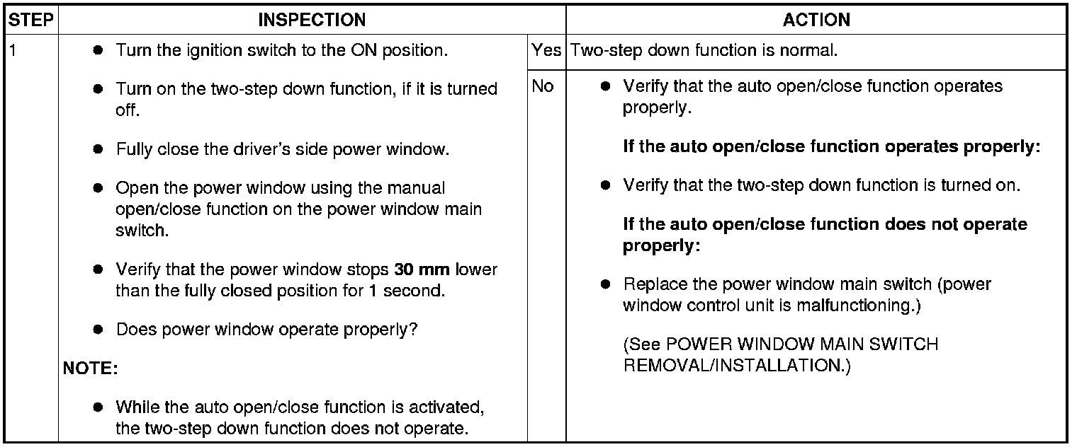 - Before inspecting the two-step down function, make sure that the two-step down function is turned on (if the two-step down function is turned off, the power window does not stop once).