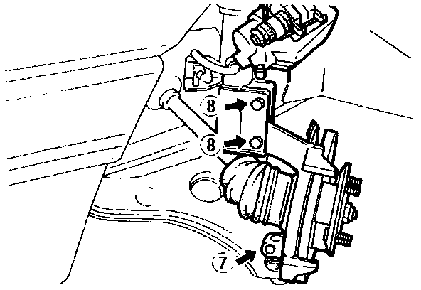 7. Remove the clamp bolt and nut (7) from the ball joint, and push the lower arm downward to separate the knuckle and the ball joint.